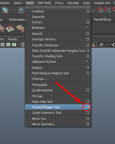 6)상단의 mesh 메뉴에서 create polygon tool의 옵션을 선택합니다.
