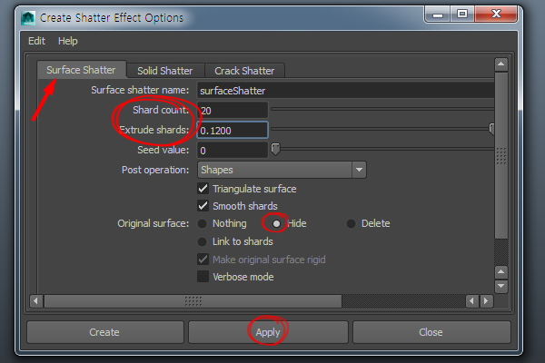 4)surface shatter 탭에서 조각의 개수(shard count), 조각의 두께(extrude shards)를 설정합니다.
