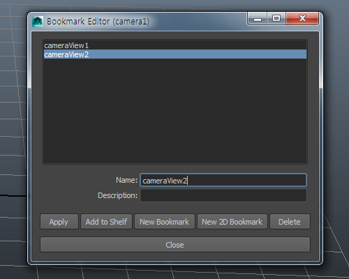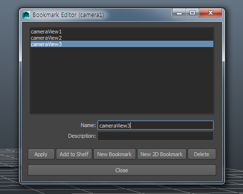 (camera1 뷰의 북마크를 생성했기때문에 해당 뷰포트가 camera1 설정되어있어야 북마크 목록을 표시합니다)