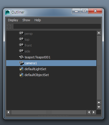 11)아웃라이너(outliner)에서 카메라(camera1) 오브젝트를 선합니다.
