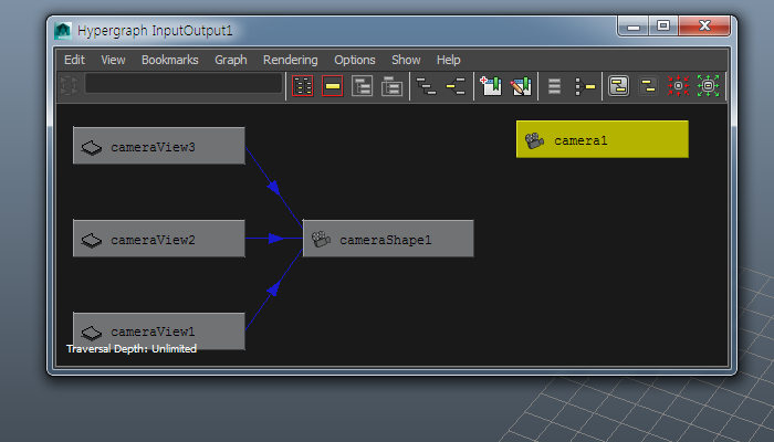 14)camera1 오브젝트의 북마크 설정 input, output 연결을 확인할수있습니다.