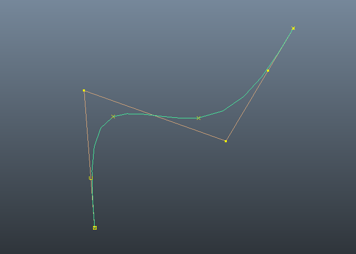 3)뷰포트에 마우스 좌클릭하면 위치에 CV(control vertex)를 추가합니다. CV Curve Tool는 커브의 CV 위치를 설정하여 곡선을 생성합니다. Curve degree를 3Cubic으로 설정한경우 4개(3+1)의 CV가 곡선의 스팬(span)을 구성합니다.