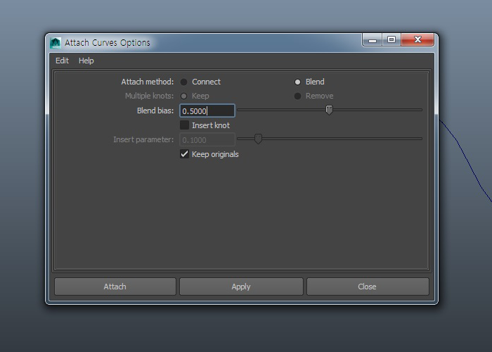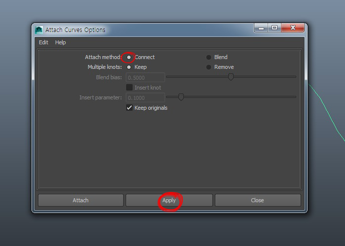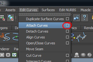 2)상단의 Edit Curves 메뉴에서 Attach Cruves 옵션을 선택합니다.