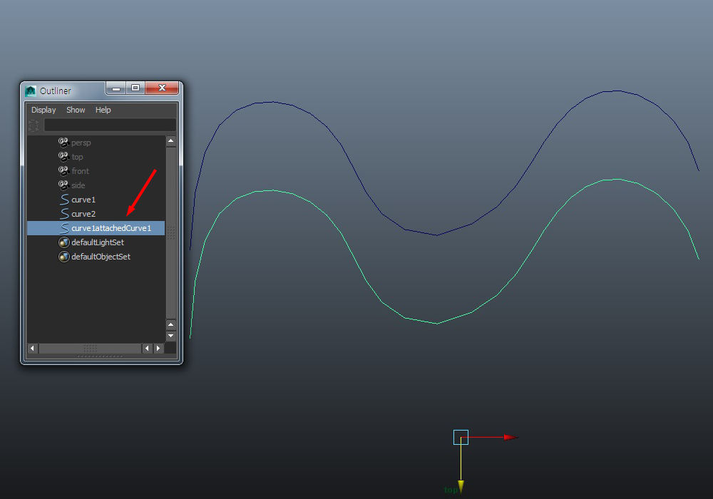 5)두 커브를 붙이고 연결한 새로운 attached curve 오브젝트를 확인할수있습니다.
