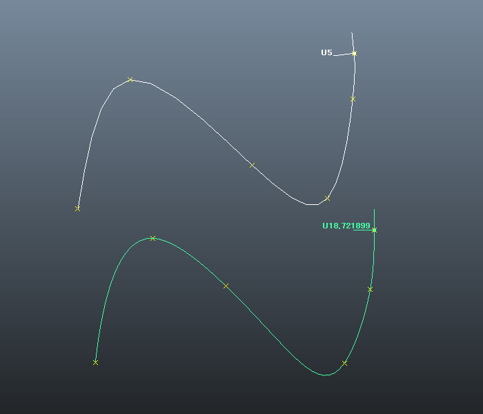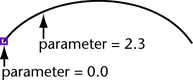 커브를 생성할때 EP(Edit point)의 Parameter 값은 정수로 증가합니다. 첫 번째 EP(커브의 시작점)는 항상 0.0이고 두 번째 EP는 항상 1.0이고 세 번째 EP는 항상 2.0입니다. 커브 위의 특정 포인트는 전후에있는 두 EP의 Parameter Value의 사이값을 갖습니다.