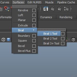 2)상단의 surfaces 메뉴에서 세가지 종류의 birail Tool을 확인할수있습니다.