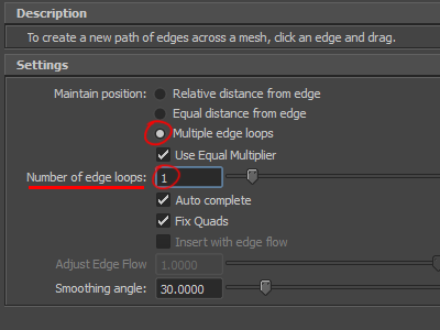 8)maintain position에서 multiple edge loops를 선택하고 number of edge loops를 1로 설정합니다.