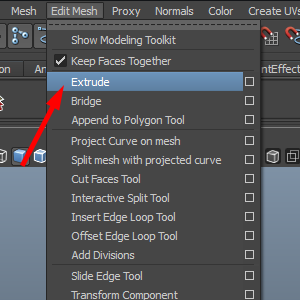 6)edit mesh 메뉴에서 keep faces together에 체크하고 extrude를 선택하여 두께를 생성합니다.