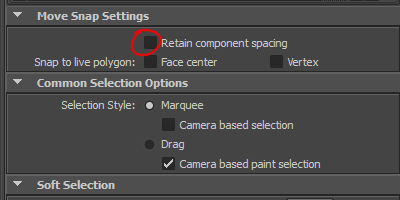 4)modify 메뉴에서 transformation tools의 move tool로 이동합니다. move snap settings의 retain component spacing를 체크해제합니다(retain component spacing를 체크하면 snap으로 컴포넌트를 이동할때 간격을 유지합니다)