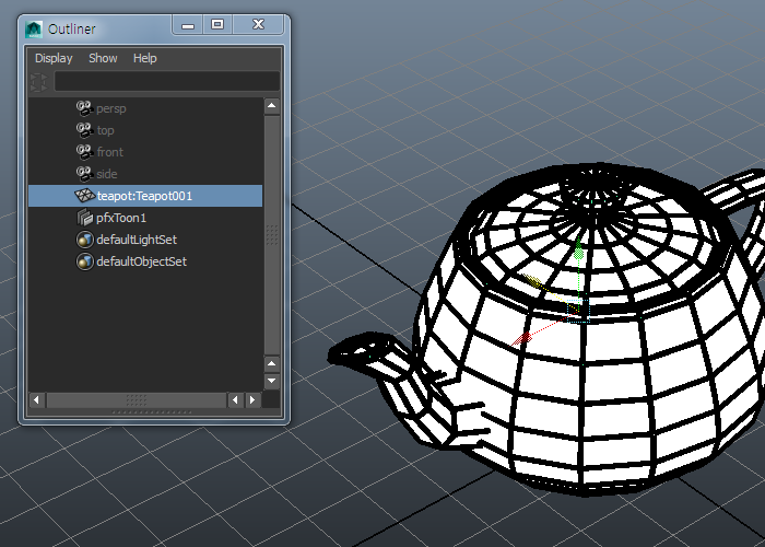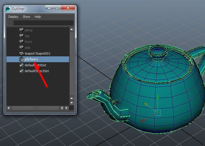 4)아웃라이너(outliner)에서 pfxtoon 노드가 생성된것을 확인할수있습니다.