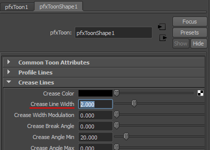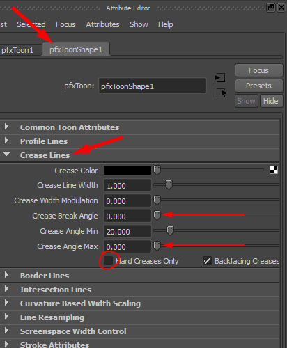 6)pfxtoonshape 노드의 crease lines에서 crease break angle, angle max에 0을 입력하고 hard creases only를 체크해제합니다.