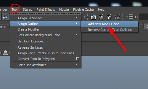 3)오브젝트를 선택하고 상단의 Toon 메뉴에서 assign outline의 add new toon outline을 선택합니다.
