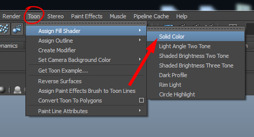 9)오브젝트를 선택하고 상단의 Toon 메뉴에서 assign fill shader의 solid color를 선택합니다.