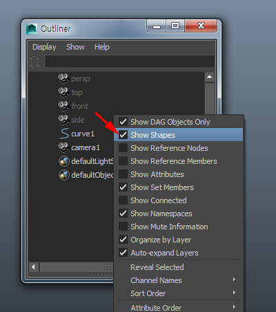 11)아웃라이너(outliner)에서 마우스 우클릭하고 show shapes에 체크합니다.