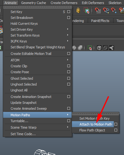 3)animation 메뉴세트를 선택하고 상단의 animate 메뉴에서 attach to motion path를 선택합니다.