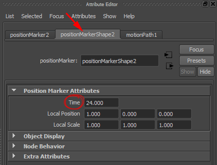 13)positionmarkershape 노드의 속성에서 time의 기본값 24로 설정되어있는것을 확인할수있습니다.