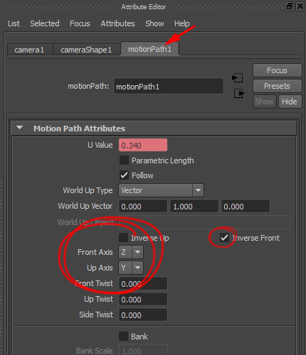 7)motionpath 노드의 motion path arrtibutes에서 front axis, up axis를 설정하여 카메라의 방향을 설정합니다.