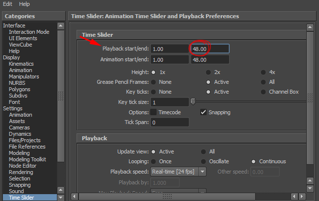 10)타임슬라이더(time slider)의 playback end를 24프레임의 두배인 48프레임으로 설정합니다.