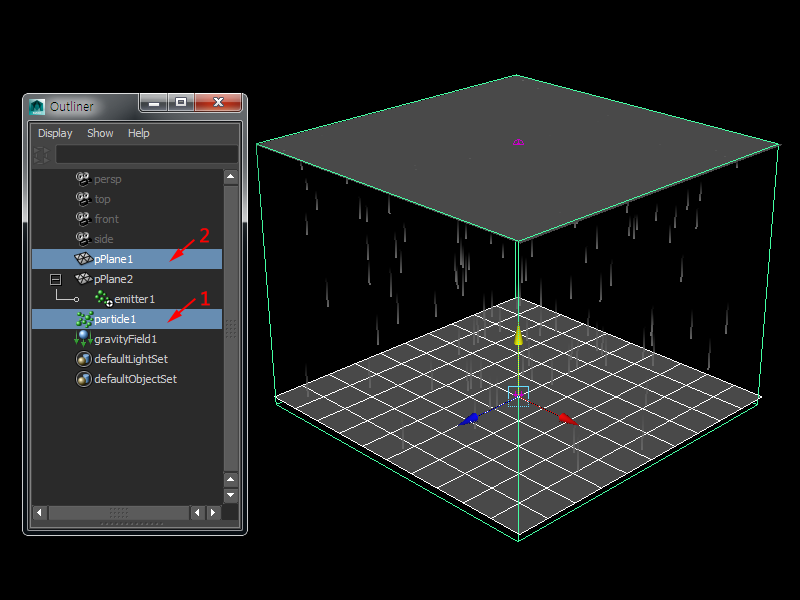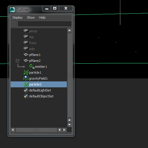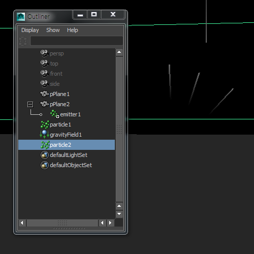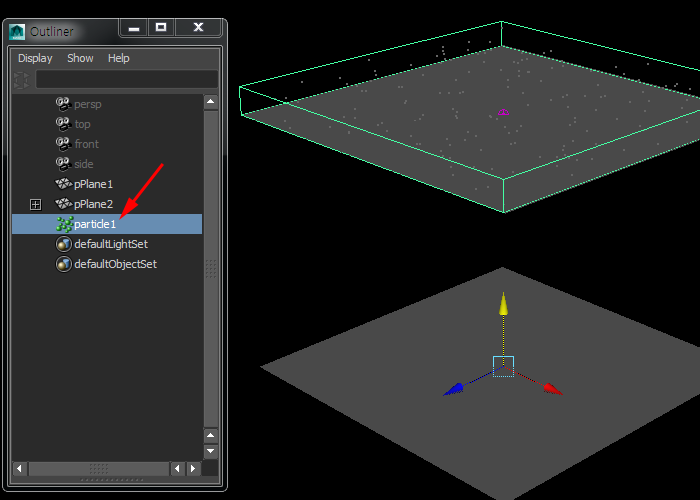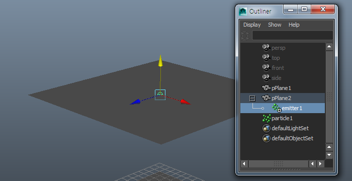 6)outliner에서 plane2의 하위에 emitter가 생성된것을 확인할수있습니다.