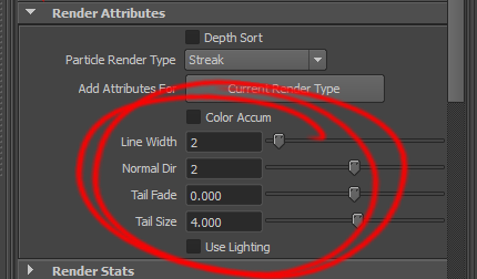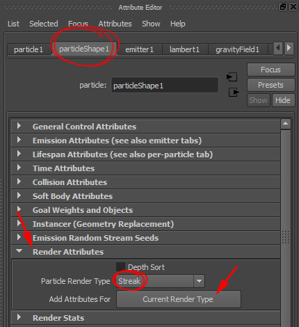 render attributes의 particle render type에서 streak를 선택하고 current render type를 클릭합니다.