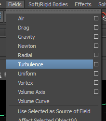 24)상단의 fields 메뉴에서 turbulence를 선택하여 씬에 난기류를 추가합니다.