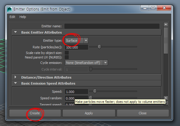 5)emitter type를 surface로 선택하고 create를 클릭합니다.