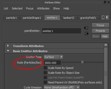 27)emitter 노드의 속성에서 rate(particles/sec)를 설정하여 초당 방출하는 파티클의 개수를 설정합니다.