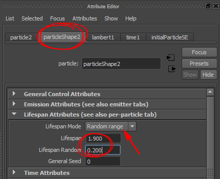 lifespan attributes의 lifespan mode에서 random range를 선택합니다. 수명(lifespan)과 수명 랜덤(lifespan random)을 설정합니다. 아래 예에서 파티클의 수명을 최소값 1.7(1.9-0.2)에서 최대값 2.1(1.9+0.2) 이내에서 무작위로 설정합니다.