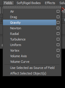 9)파티클 오브젝트를 선택하고 상단의 fields 메뉴에서 gravity를 선택합니다.
