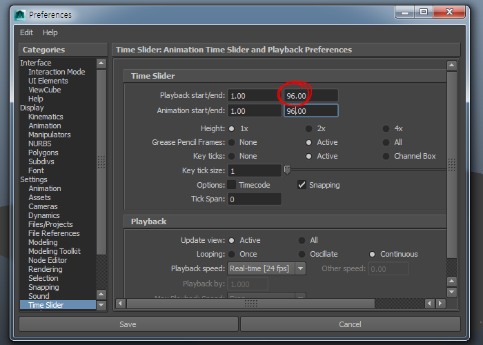 2)preferences의 타임슬라이더(time slider)에서 플레이백 및 애니메이션 범위를 설정합니다(96, 4초)