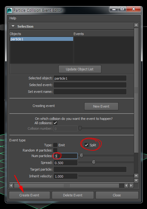 하단의 event type에서 split에 체크하고 num particles를 3으로 설정한후에 create event를 클릭합니다.