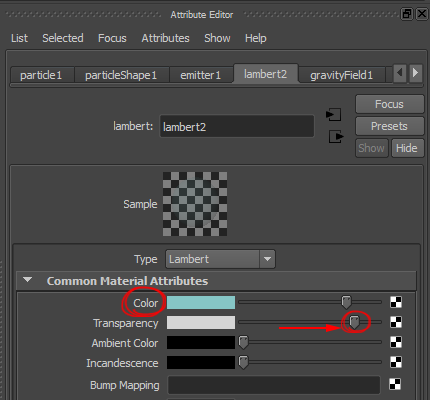 23)새로운 재질(lambert)를 생성하고 transparency(투명도)를 설정합니다. 이 재질을 파티클 오브젝트(내리는 비, particle1)에 할당합니다.