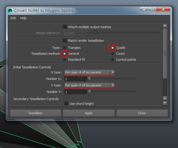 12)type의 quads와 tessellation method의 general에 체크하고 적용합니다(apply)