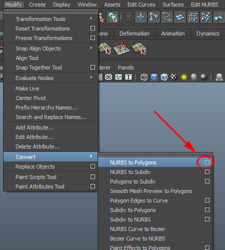 11)loftedsurface를 선택하고 상단의 modify 메뉴에서 convert NURBS to polygons의 옵션을 선택합니다.