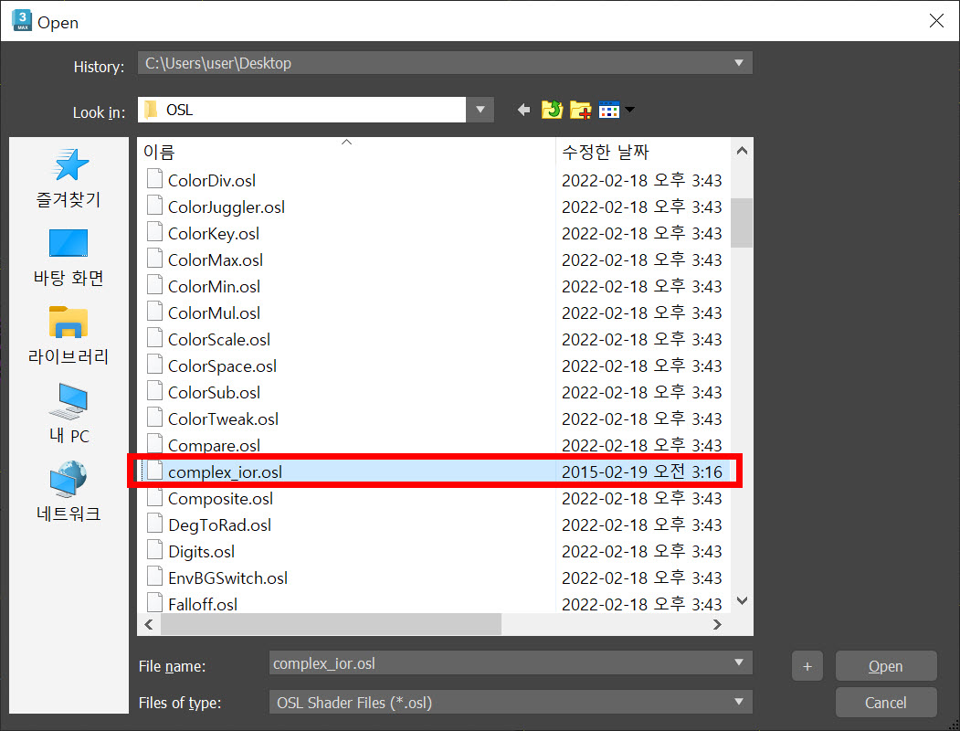 6)다운로드한 OSL파일(complex_ior.osl)을 선택합니다.