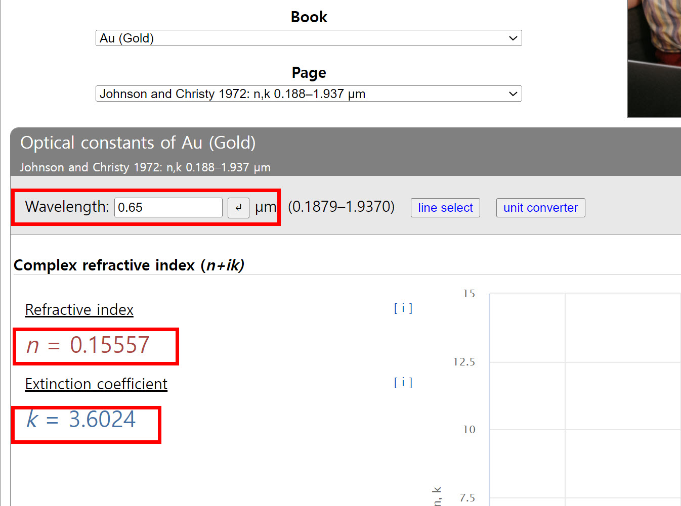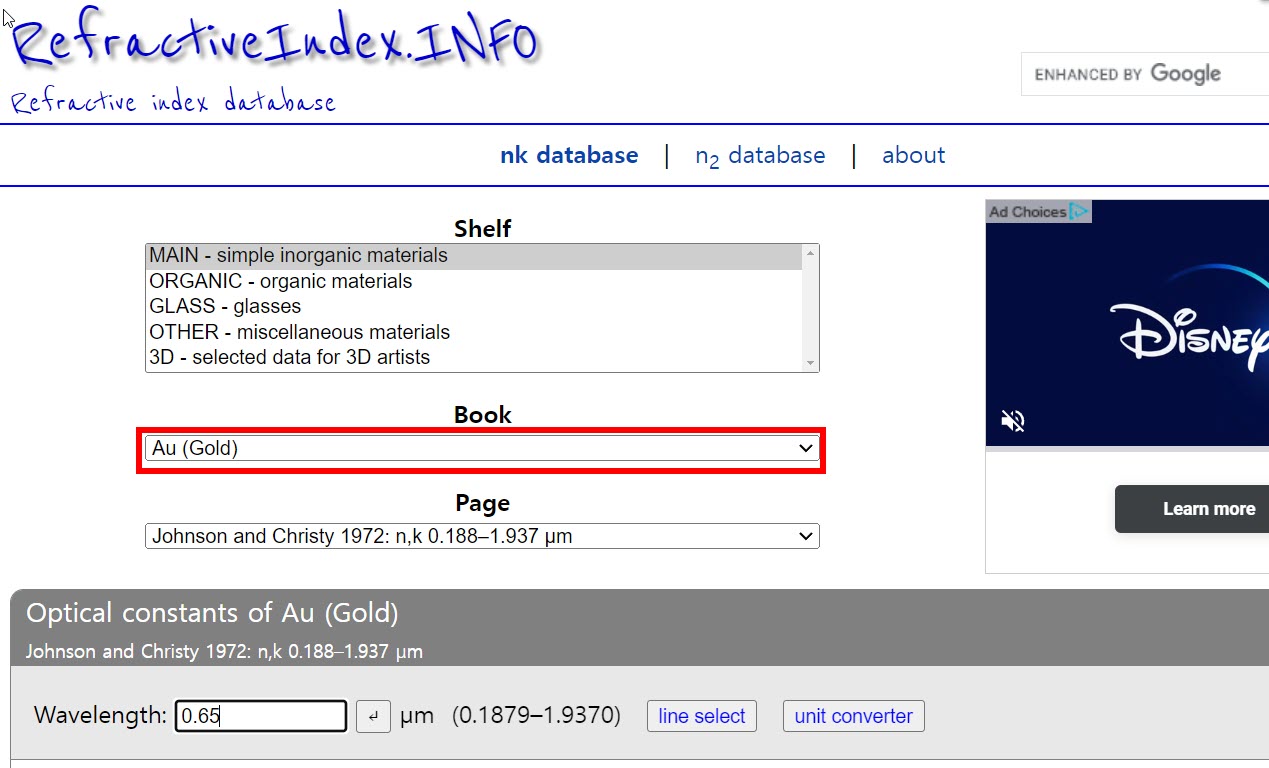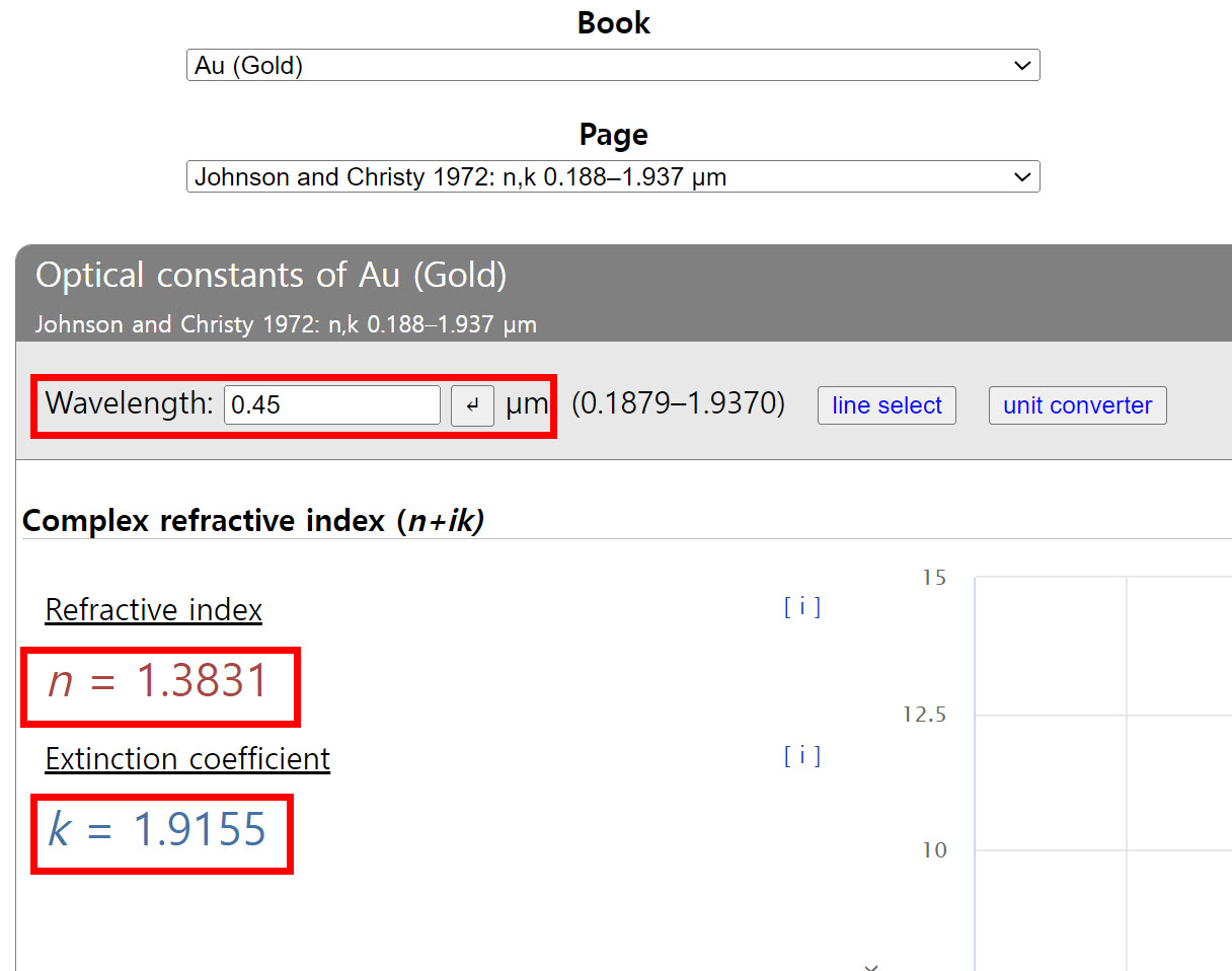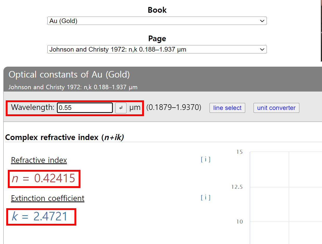 파장(wavelength)을 입력하면 해당 파장에 대한 refractive index, extinction coefficient를 표시합니다.