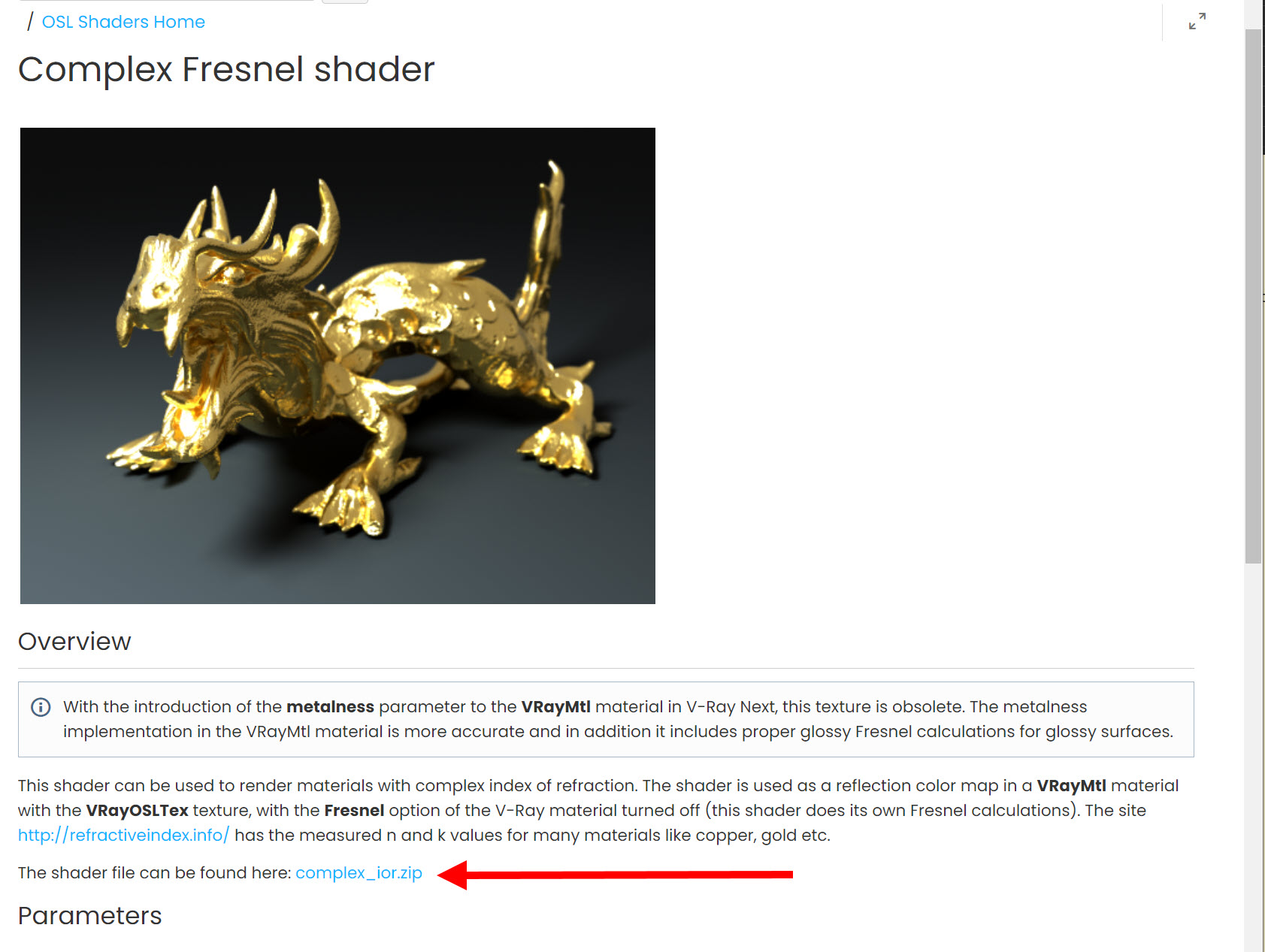 1)아래 카오스그룹 웹사이트에서 complex fresnel shader의 OSL 쉐이더 파일을 다운로드합니다(complex_ior.zip)