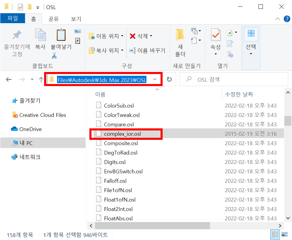 2)3D 맥스 프로그램 설치 폴더의 OSL 폴더에 다운로드한 쉐이더 파일(complex_ior.osl)을 위치시킵니다.