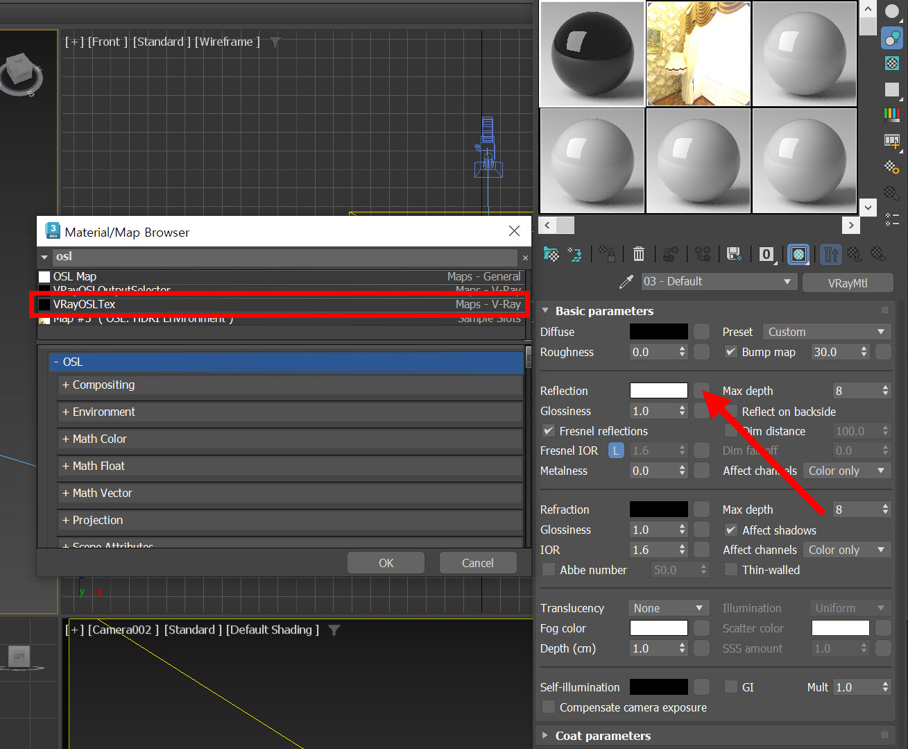 4)reflection에 VRayOSLTex 맵을 설정합니다.