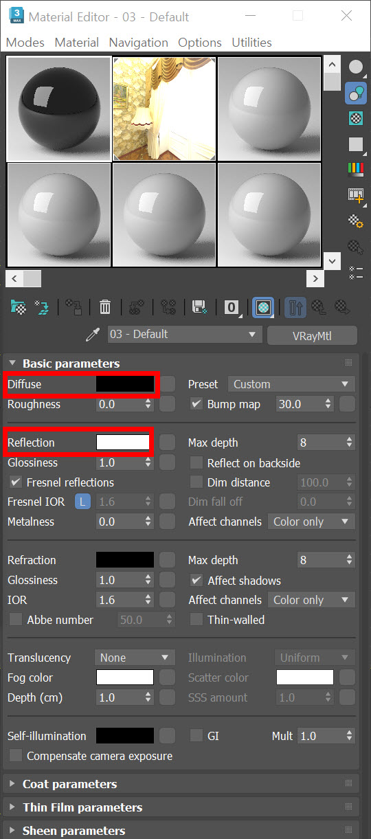 3)새로운 브이레이 재질을 생성하고 재질의 diffuse, reflection 색상을 아래와 같이 설정합니다.