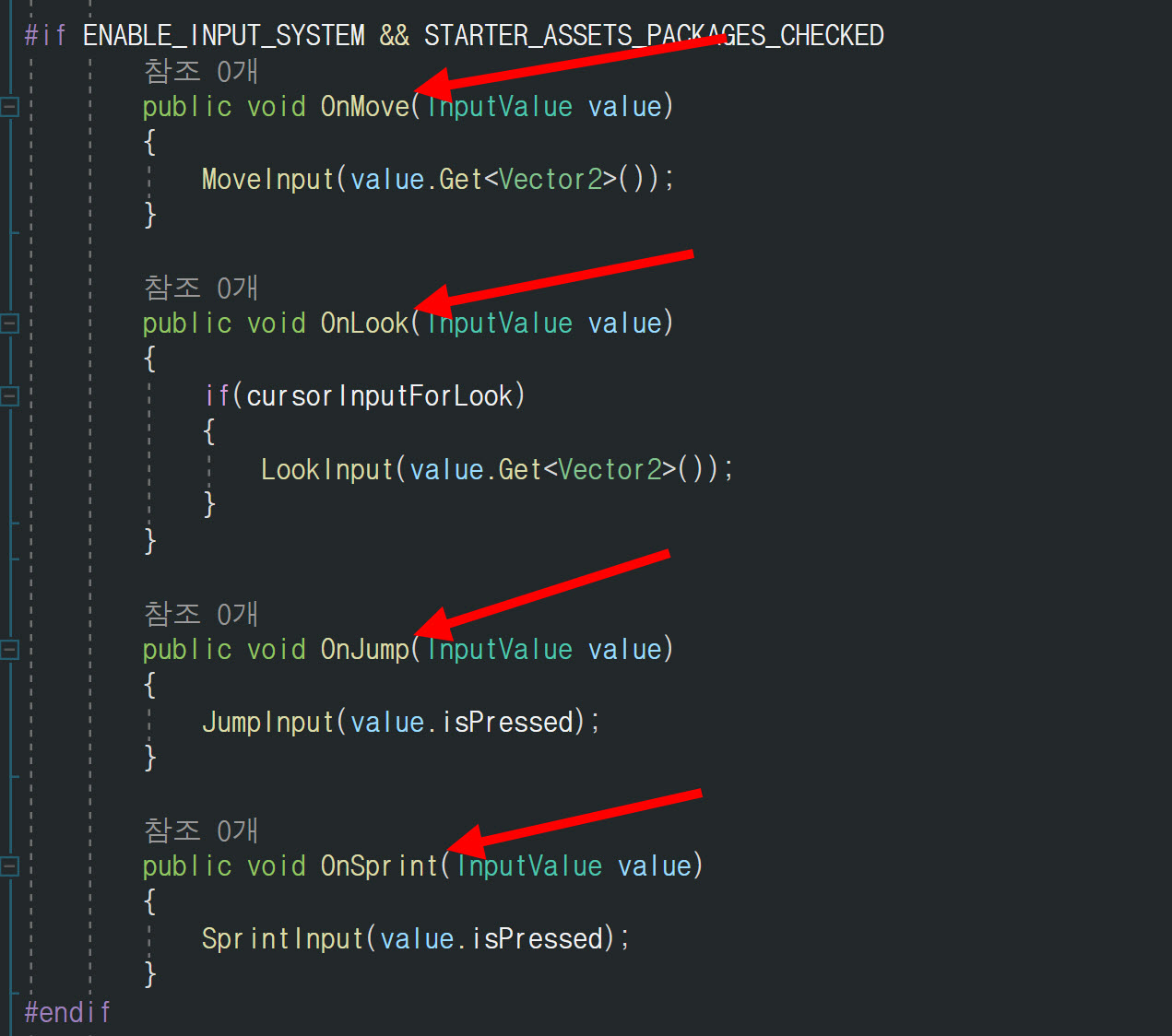 9)게임오브젝트의 스크립트에서 플레이어의 액션에 대한 함수를 정의합니다.