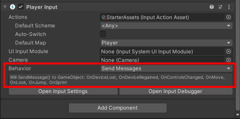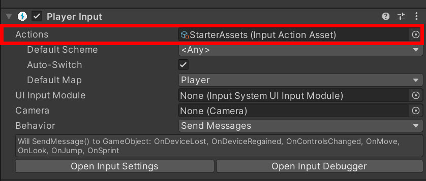 8)PlayerInput 컴포넌트의 behaviour에서 send messages 함수 목록을 확인할수있습니다. input action asset에서 설정한 액션의 이름과 함수의 이름이 동일한것을 확인할수있습니다(OnMove, OnLook, OnJump, OnSprint)