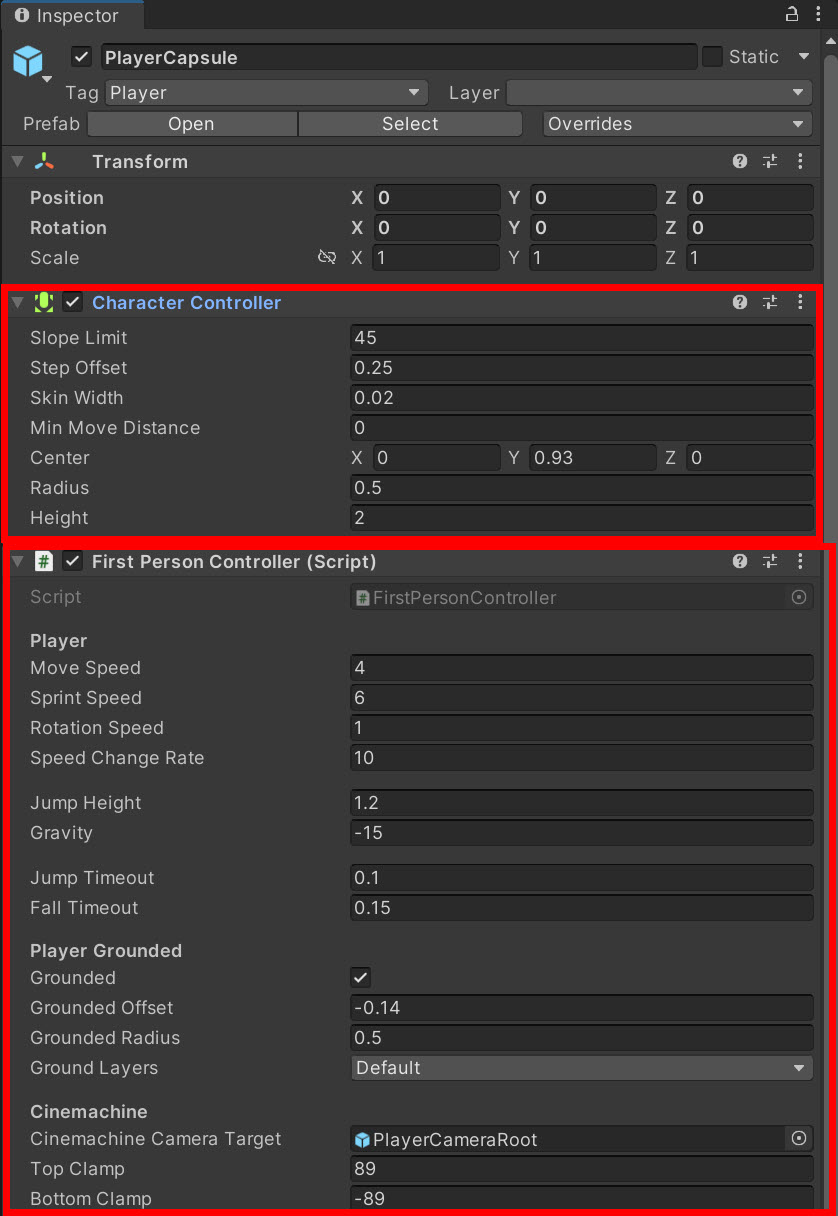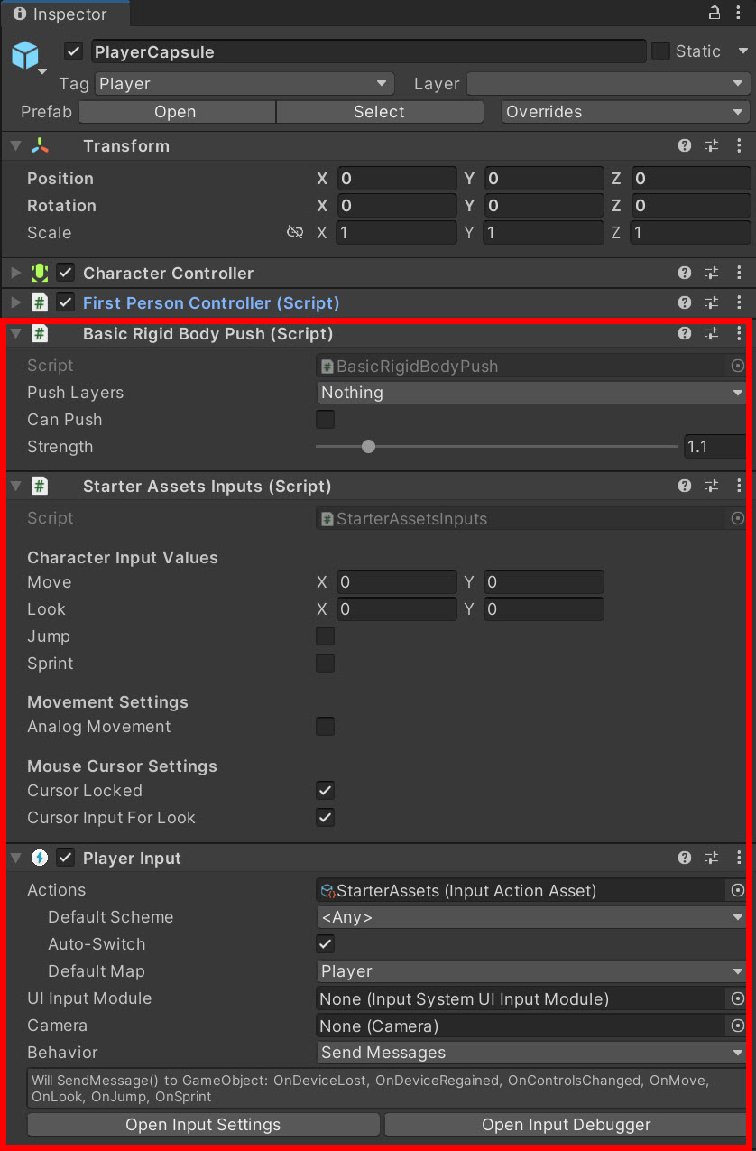 4)PlayerCapsule 오브젝트를 선택하고 게임오브젝트를 구성하는 컴포넌트와 설정된 속성들을 확인합니다.