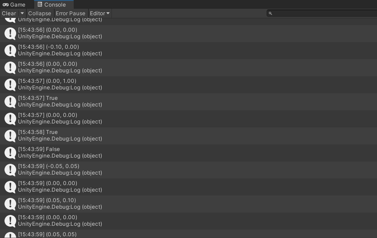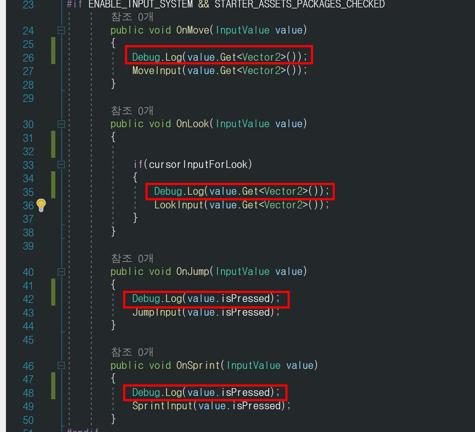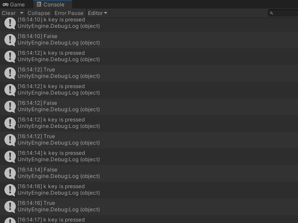 10)Debug.Log 함수를 사용하여 런타임에 키 입력에 대한 입력값을 출력하여 확인합니다.