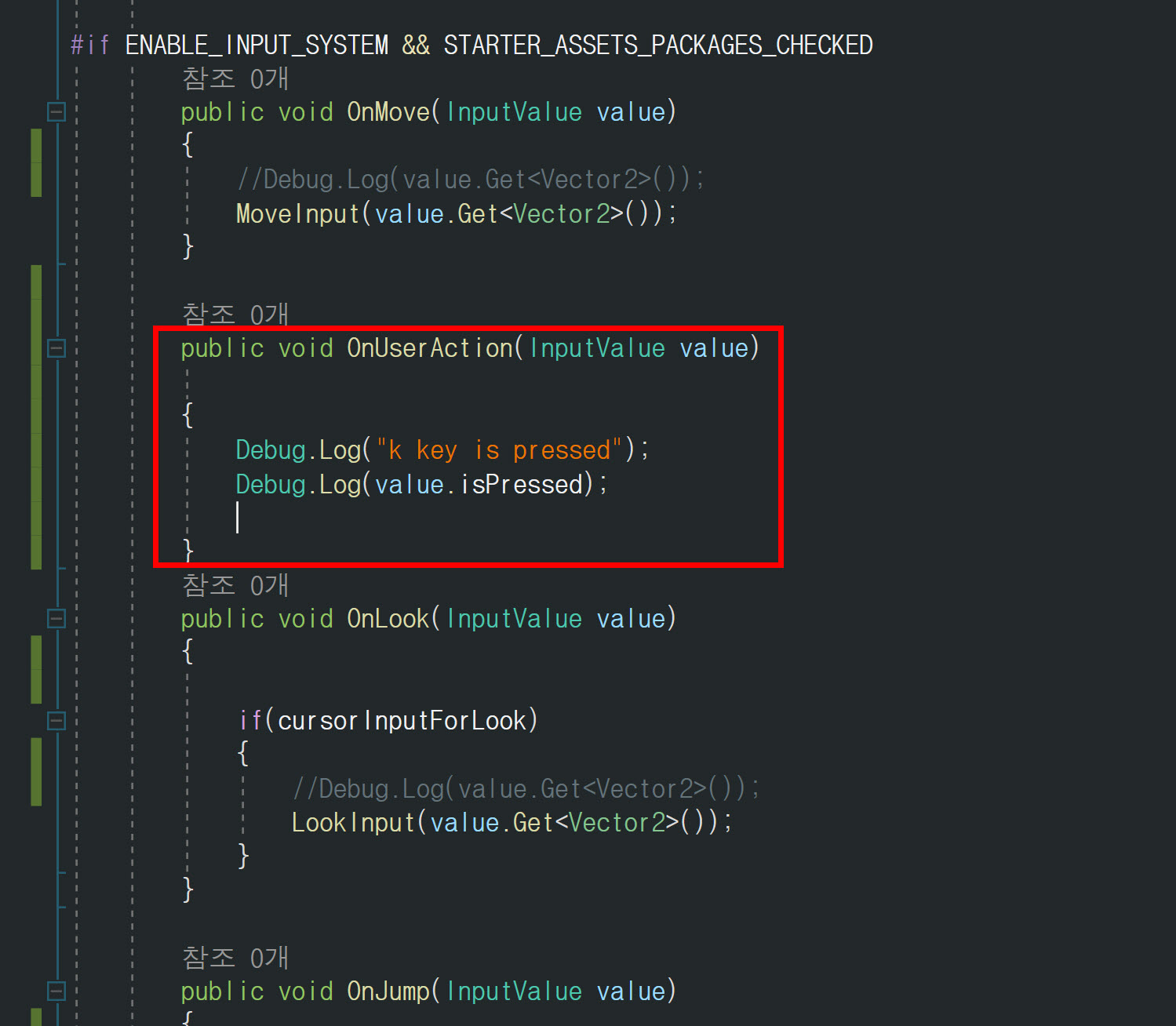 16)스크립트에서 OnUserAction함수를 사용하여 K 키 입력에 대한 행동을 정의합니다.