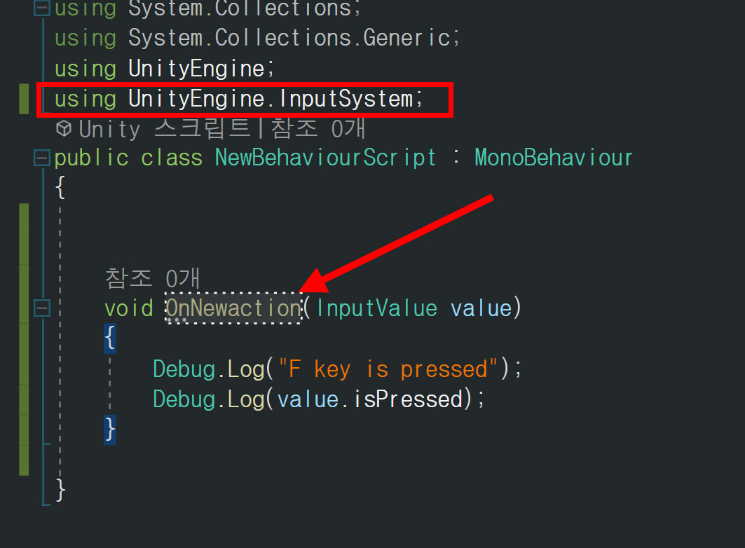 14)게임오브젝트의 스크립트에서 OnNewaction함수를 사용하여 액션에 대한 행동을 정의합니다.