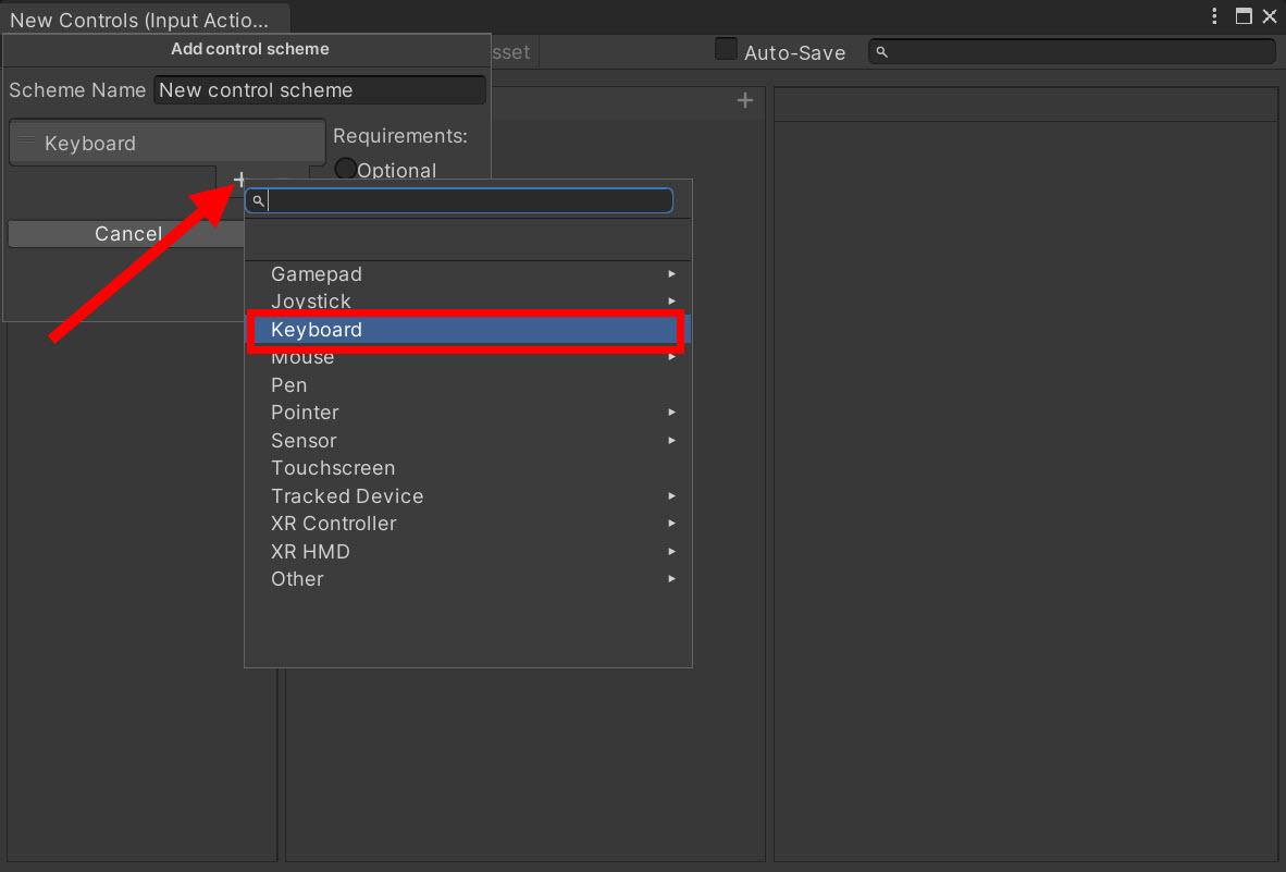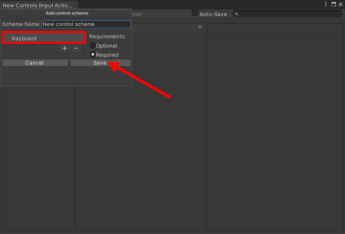 4)새로운 control scheme의 이름을 설정하고 유형을 선택한후에 저장합니다(New control scheme)