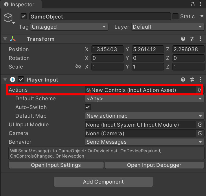 12)PlayerInput 컴포넌트에서 Actions에 사용자가 설정한 input actions 에셋을 참조시킵니다.