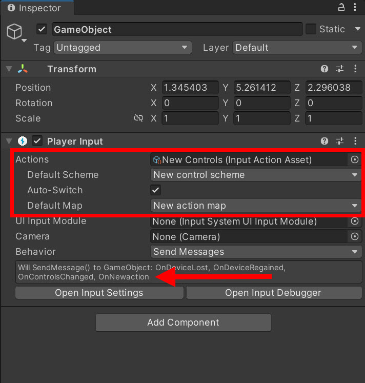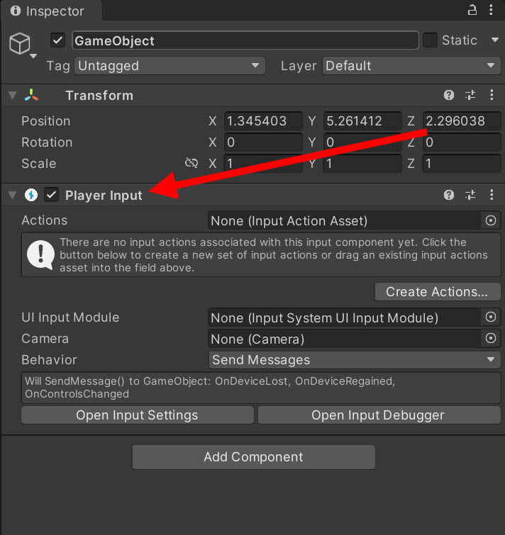 11)게임오브젝트에 PlayerInput 컴포넌트를 추가합니다.