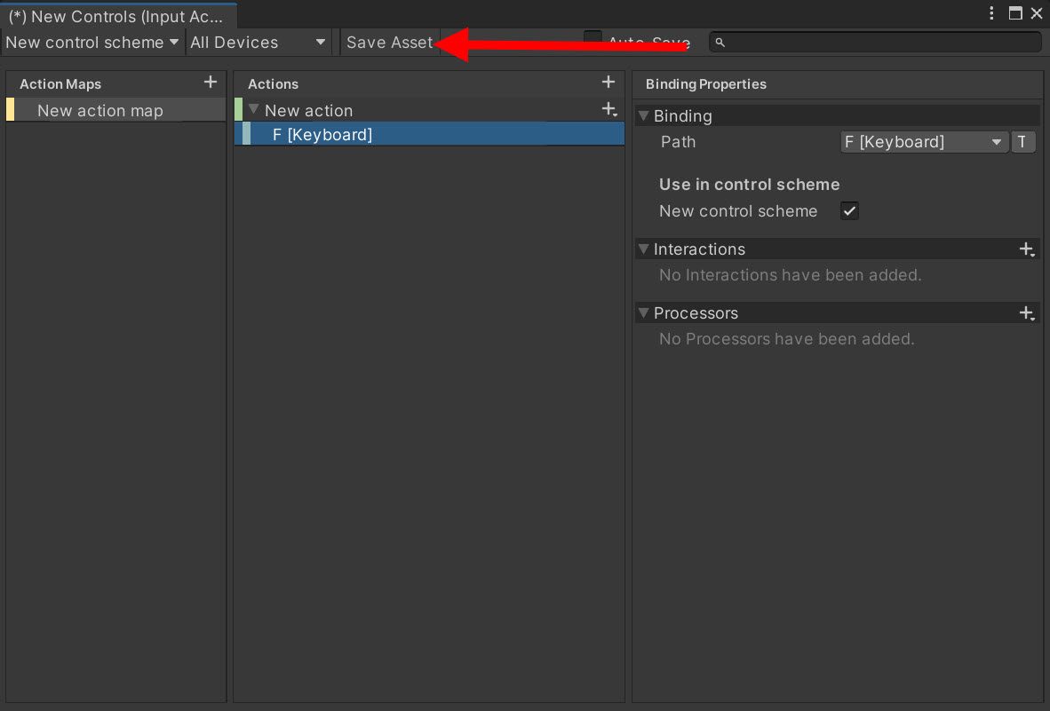 9)input action를 저장하려면 save asset을 클릭합니다.